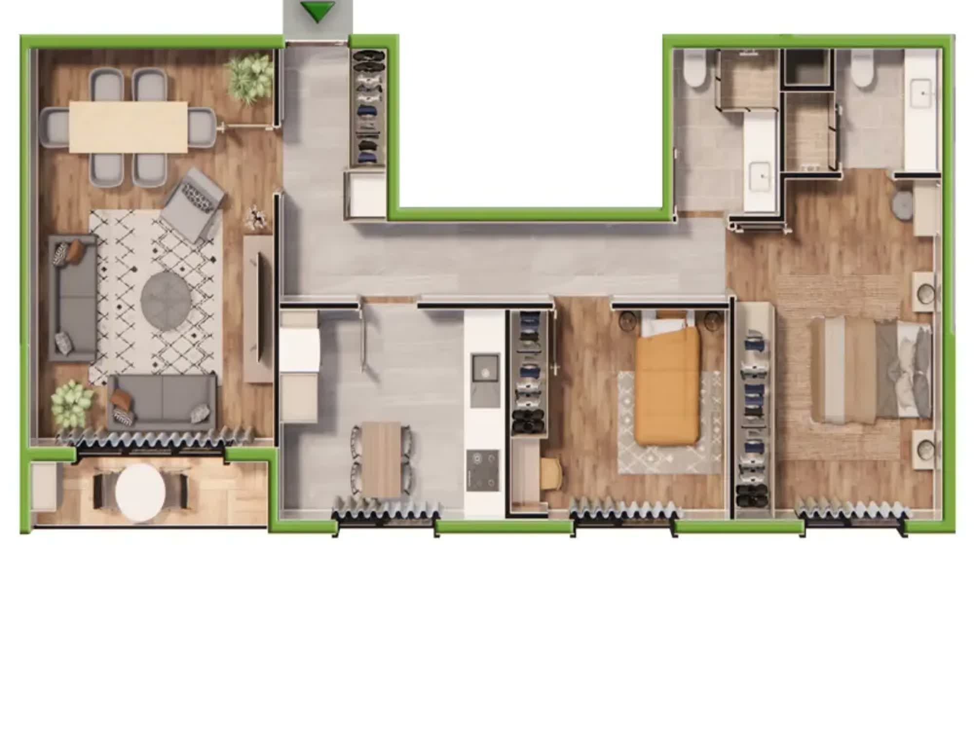 Ulaşım akslarına yakın lokasyonuyla dikkat çeken projede 148 metrekare rahat yaşam alanı sunan konut.